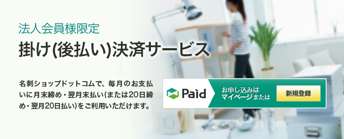 Paid(ペイド)は、株式会社ラクーンが運営する「法人様専用の掛け(後払い)決済サービス」です。 お客様はPaidに登録することで、初回から掛け支払いでの取引が可能となります。 商品の注文・発送は名刺ショップドットコムから、代金は支払日にPaid指定の銀行口座へお振り込みいただきます。 取引の障害となる条件交渉や書類提出の手間を気にすることなく、新規取引でも安心してご利用いただけます。