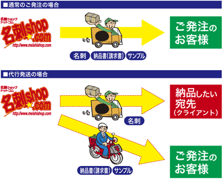 通常発送ですと、完成した名刺と納品書(請求書)を一緒同梱してお届け先に配送いたします。ここで『代行配送』を選択いただきますと、あたかもご登録先(ご発注者様)から直接お届け先のクライアント様へ直送納品したようにお届けが可能です。その場合、お届け先へは、名刺本体のみが納品され、弊社からのご請求書はもちろん、配送伝票や梱包材に至るまで、全てに弊社が特定できるような印刷物や記載をせずに発送をいたします。 ※納品書(ご請求書)と、印刷サンプルは直納するお名刺とは別に普通郵便にてご登録先(ご発注者様)へお送りいたします。